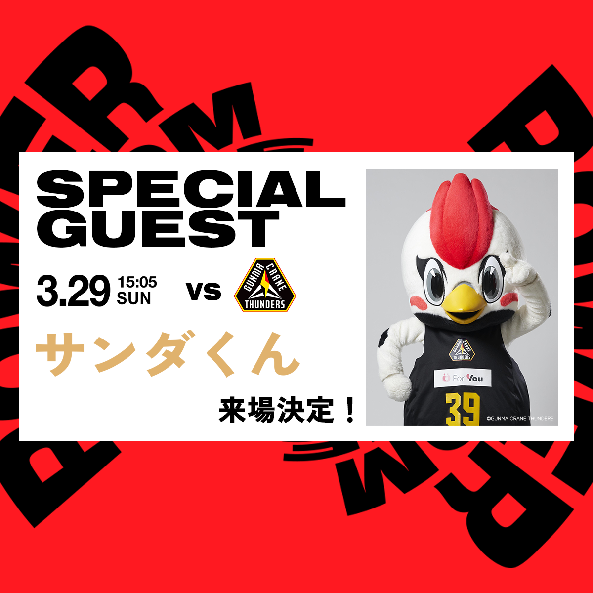 3月29日(日)群馬戦 群馬クレインサンダーズ公式マスコット “サンダくん” 来場決定!
